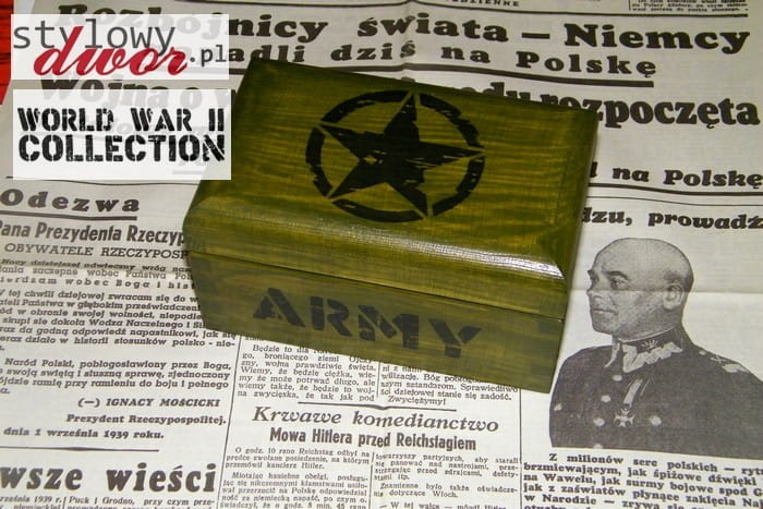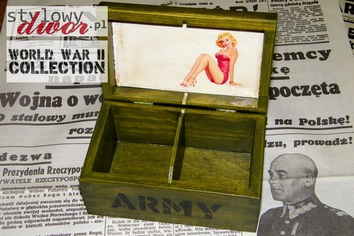 Prezentujemy państwu unikatową, ręcznie zdobioną skrzynkę na wino zdobioną w stylu skrzynki na amunicję. Skrzynka wyłożona jest wełną drzewną! Pudełko posiada wkładkę przytrzymująca butelkę i zatrzask. Wymiary zewnętrzne 35 x 10,5 x 10,5 cm. Ręczne zdobienie nadaje każdemu egzemplarzowi niepowtarzalny charakter! Na zdjęciach zaprezentowano ogólne cechy pudełek w serii. Poszczególne pudełka mogą się w rzeczywistości nieznacznie różnić.