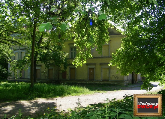 Zdjęcie elewacji bocznej dworu zostało przez nas wykonane z nieco bliższej perspektywy, ponieważ alejka, na której sto lat temu stał Leonard Durczykiewicz ze swoim aparatem stanowi dziś zarośniętą i zaniedbaną częścią parku, który w całości prezentuje się jednak nienajgorzej.