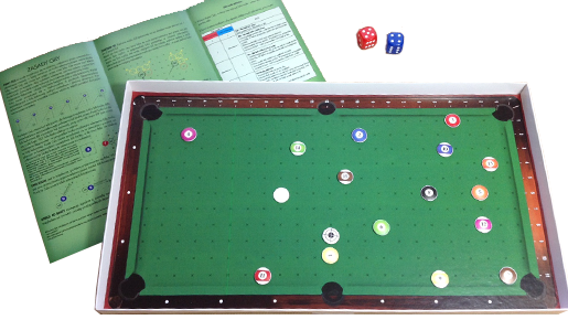 W zestawie znajduje się plansza, dwie kostki do gry oraz 15 pionków imitujących bile.
