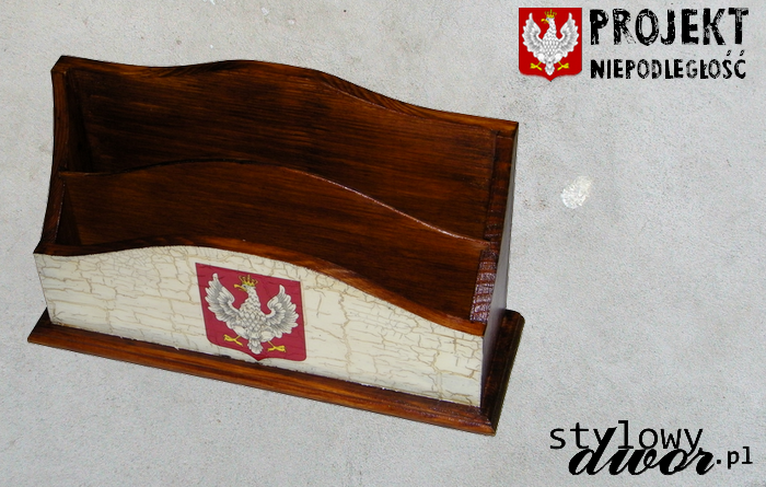 W tym miejscu prezentujemy państwu unikatowy, ręcznie zdobiony listownik z polskim herbem z roku 1919. Listownik o wymiarach 27x17x8,5cm przeznaczony jest na różne dokumenty np. listy, notatki, rachunki, przepisy. Listownik został wyposażony w filcowe podkładki, dzięki którym może bezpiecznie stać na wszystkich drewnianych meblach. Ręczne zdobienie nadaje każdemu egzemplarzowi niepowtarzalny charakter! Na zdjęciach zaprezentowano ogólne cechy listowników w serii. Poszczególne egzemplarze mogą się w rzeczywistości nieznacznie różnić.