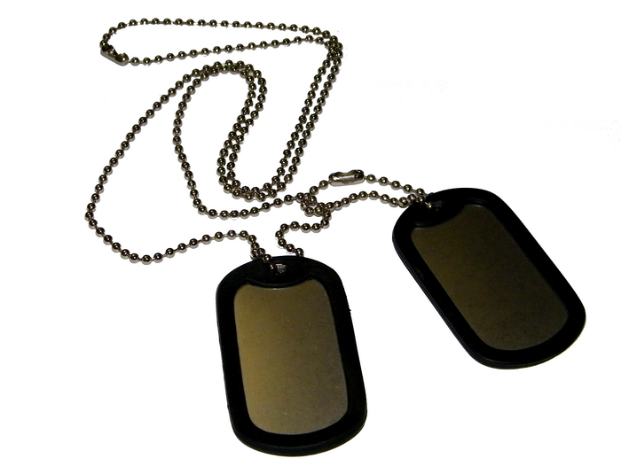 Nieśmiertelnik US Dog Tag, w skład którego wchodzą 2 blaszki z gumkami oraz 2 łańcuszki (długi i krótki). Nieśmiertelnik jest czysty - bez żadnych napisów.