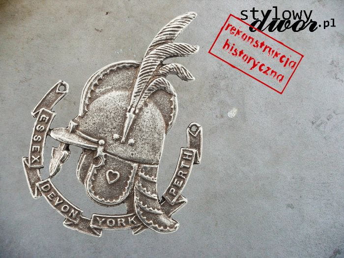 Przypinka z odznaką pamiątkową obsady dywizjonów załóg pociągów pancernych w Wielkiej Brytanii. W czasie przygotowań do odparcia niemieckiej inwazji na Wyspy Brytyjskie w 1940 r. stworzono 4 dywizjony z polskimi żołnierzami obsługujące 12 pociągów pancernych. Odznakę dla nich zaprojektował Stanisław Bahrynowski zawierajac szyszak husarski z pióropuszem. Szyszak od dołu opasany był wstęgą z nazwami hrabstw i miast: "ESSEX-DEVON-YORK-OERTH", gdzie działały polskie pociągi pancerne. Przypinka w kolorze starego srebra. Materiał: znal. Wymiar: 58mm x 40mm. Zapięcie: nakrętka