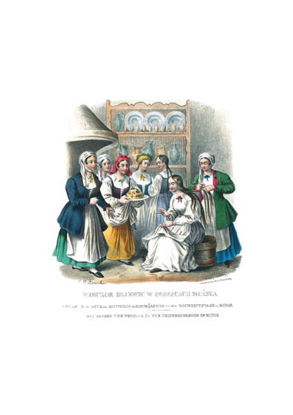 Reprint grafiki z książki "Stroje Ludowe Narodu Polskiego z wiernym opisaniem jego obyczajów, zwyczajów, i sposobu bycia" Leona Zienkowicza.