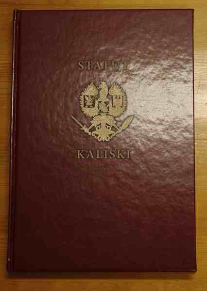 Książka oprawiona w ekoskórę z miniaturą złotego orła z teki pierwszego wydania Statutu z lat 1926-1928 jest integralną częścią Reprintu STATUTU KALISKIEGO A. Szyka. Do sprzedaży trafiła tylko niewielka ilość tych książek dla tych, którzy jeszcze nie zdecydowali się na zakup teki.