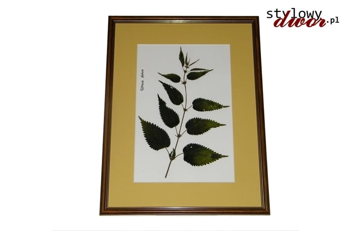 Pokrzywa zwyczajna (Urtica dioica L.) – gatunek rośliny z rodziny pokrzywowatych (Urticaceae). Występuje w stanie dzikim w Europie, Azji, Afryce Północnej, Ameryce Północnej, a zawleczona została także na inne obszary i kontynenty. Rośnie w wilgotnych lasach i zaroślach oraz bardzo często, jako gatunek synantropijny, na żyznych siedliskach ruderalnych. Pokrzywa zwyczajna jest użytkowana na wiele sposobów – jest rośliną leczniczą i kosmetyczną, jadalną i paszową, dostarcza także włókien, barwnika i jest użytkowana w ogrodnictwie. Pokrzywa odgrywa też rolę w ludzkiej kulturze duchowej. Z powodu obecności kłująco-parzących włosków powoduje bolesne podrażnienia skóry ludzi i zwierząt. Prezentujemy pięknie oprawioną, zasuszoną roślinę z naszej kolekcji Zielnik Polski. Plansza z rośliną oprawiona została w barwiony passepartout oraz skromną, drewnianą ramę o wymiarach 42,5x32,5cm.