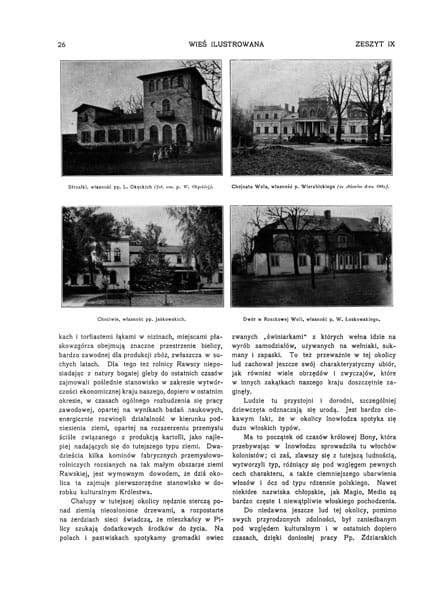 Zdjęcia: praca na polu; ruiny zamku w Olsztynie; aleja brzozowa w parku w Giełwanach; pałac w Sielnicy na Podolu; ruiny zamku w Rytwianach; Kochanowicze gub. Witebska wł. Chrapowickiego; pałac w Abramowsku; zaprzęgi wiejskie; chaty wiejskie; zamek w Książu Wielkim; zaprzęgi konne; pałac w Zatorach; zamek w Chrząstowie; zamek w Orawie; Zygmunt Gloger; dwór w Brzozówce wł. Iwickich; dwór w Małej Wsi wł. Orlewskich; dwór w Żdżarach wł. Łoskowskiego; Strzałki wł. Okęckich; Chojnata Wola wł. Wierzbickiego; Chociwie wł. Jaśkowskich; dwór w Roszkowej Woli wł. Łoskowskiego; Gostomia wł. Jackowskiej; Stolniki wł. Czapskiego; hodowla koni w Galicji.
