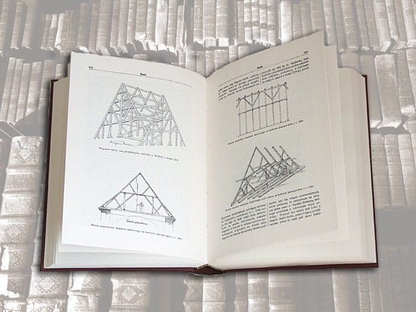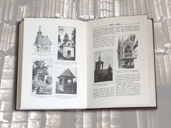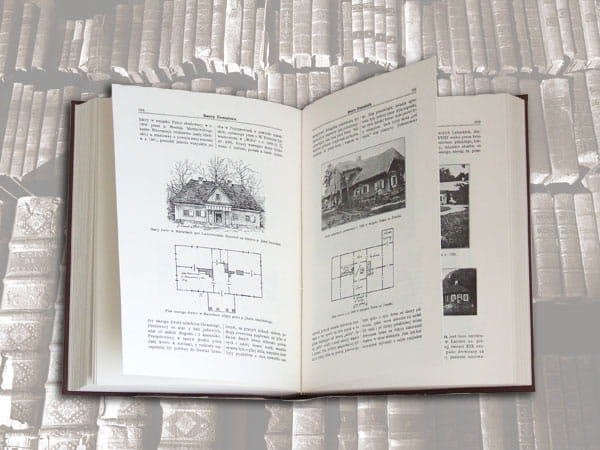 Reprint oryginału z 1907 i 1909 r. Alfabetyczny spis przykładów budownictwa drewnianego w dawnej Polsce. Ok. 550 zdjęć, rysunków i rycin dawnych cerkwi, starych domów, chat, lamusów, kościołów i kapliczek, bogato ilustrowany rozdział dotyczący dworów ziemiańskich. Dwa tomy w jednym woluminie: tom I str. 383, tom II str. 192 i kończy się na L z powodu śmierci autora. Przedruk metodą fotooffsetową.
