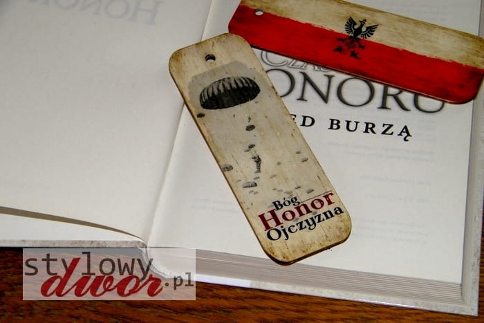 Prezentujemy państwu unikatową, drewnianą, ręcznie zdobioną zakładkę do książek z motywem Cichociemnych i hasłem "Bóg, Honor, Ojczyzna". Z drugiej strony znajduje się flaga Polski z orłem AK. Wymiary zakładki 15x5cm. Ręczne zdobienie nadaje każdemu egzemplarzowi niepowtarzalny charakter!